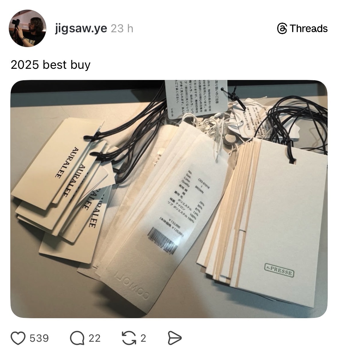 Si je ne suis pas un grand partisan du gatekeeping, je commence malgré tout à éprouver une certaine sympathie pour les créateurs japonais qui se foutent complètement de ce qui se passe hors de l’Archipel. Peut-être que c’est de ça dont on a besoin en 2026. Et certainement moins de débats sur qui est le plus puriste, sur qui a le droit de porter — ou même d’acheter — du Comoli. Ou, pour le dire autrement : qui mérite les parts d’un marché bien trop petit pour contenir les égos de special snowflakes ayant délaissé Instagram pour Substack.